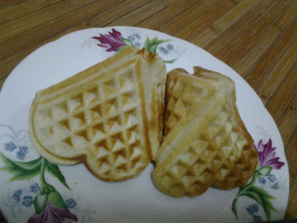 - Apabila waffle maker telah panas, tuang adunan tadi ke dalamnya dan kemudian tutup. Apabila telah kekuningan, angkat waffle tadi dengan menggunakan garfu.